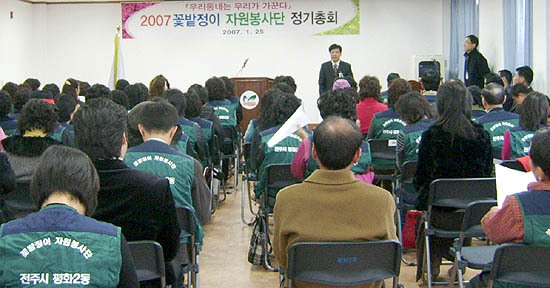 전주 완산구 평화2동(동장 은희영) 꽃밭정이 자원봉사단(대장 오평근)은 25일 동사무소에서 김태수 완산구청장과 도·시의원, 자원봉사자 150여명이 참석한 가운데 정기총회를 개최했다.
