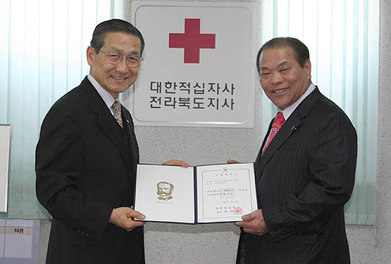 이번에 전달된 특별회비 1000만원은 올해 적십자 회비 모금액을 기준으로 2000 세대분에 해당하는 금액으로 대한적십자 전북지사 송창진 회장은 김 회장에게 적십자 특별회원증과 기념품을 전달했다.