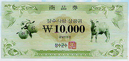 관내 540여개의 상가에서 사용할 수 있는 장수지역 상품권인‘장수사랑상품권’은 지난 2005년 7월부터 최근까지 모두 17억원의 상품권(5000원권, 1만원권)이 발행됐으며, 이 가운데 10억3000만원의 판매실적을 올리는 등 지역주민과 상가로부터 큰 호응을 얻고 있다.