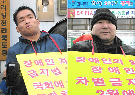 같은 날 한나라당 전북도당 당사 앞에서는 ‘작은 자 장애인 자립생활센터’에서 자원 활동으로 장애인 인권 운동을 하는 김승중씨(43·평화동)가 1인 시위에 나섰다.