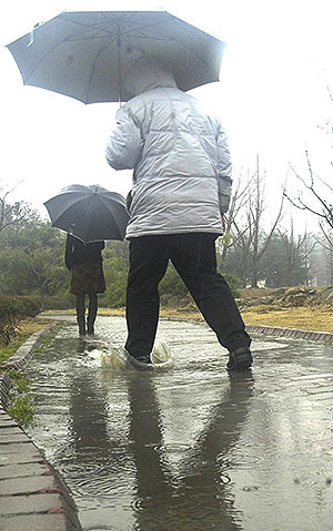 8일 오전 10시 30분 경, 덕진 공원내 산책로 곳곳이 물웅덩이다. 바로 옆에 연못을 끼고 있는데도 배수가 제대로 안돼 조금만 비가 와도 이만저만 불편한게 아니다. 물웅덩이의 크기도 장난이 아니다. 산책로를 통째로 막아서고 있다. 물가는 괜찮겠지 하고 돌아가려고 시도해보지만 역시 마찬가지다. 발이 푹푹 빠진다.