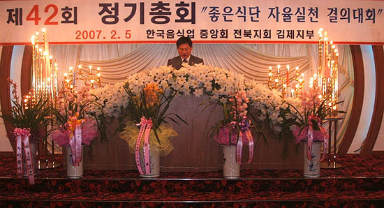 한국음식업조합중앙회 전북지회 김제시지부(지부장 나병문)는 최근 100여명의 회원들이 참석한 가운데 제42회 정기총회를 갖고 음식문화 개선을 위한 좋은 식단 자율실천 결의대회를 개최했다.