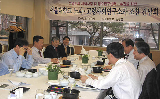 14일 서울대 호암 교수회관에서 가진 간담회에는 강인형 군수를 비롯 군 관계자와 박상철 서울대 노화고령사회 연구소장, 이정재 서울대 학생처장, 한경혜 서울대 생활대학장, 박삼옥ㆍ최성재ㆍ곽충실 교수 등 20여명이 참석했다.