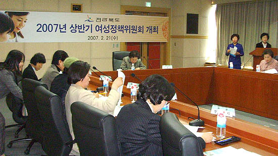 2007년 상반기 전라북도 여성정책위원회가 21일 도청 회의실에서 열렸다. 이날 위원회는 올해 전북도 여성정책 사업계획을 위원들에 설명하고, 또 올 상반기중으로 통합되는 여성발전기본조례(안)에 대한 위원들의 의견을 청취하기 위해 마련됐다.