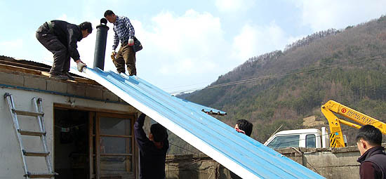 진안군 공무원들이 주축이 된 ‘불꽃회(회장 박준선)‘가 지난 5일 갑작스런 돌풍으로 지붕이 날아간 이순월(주천면 대불리)할머니 댁을 찾아 지붕 주위 정리 및 천막설치작업을 벌였다.