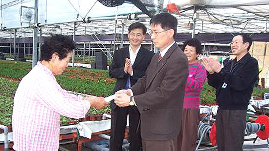안기선 면장을 통해 이날 전달된 100만원은 황할머니가 평소 직장으로 다니던 명정원예에서 받은 급료의 일부.