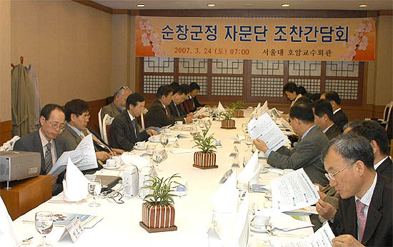 순창군이 군정역점시책의 효율적인 추진을 위해 주요현안사업 연구용역 책임연구원과 관련공무원이 한자리에 모인 가운데 24일 서울대 호암회관에서 조찬간담회를 갖고 현재 수행중인 학술용역의 성공적인 추진방안을 모색하는 시간을 가졌다.