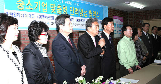 전북여성교육문화센터와 (주)데크 등 도내 6개 중소기업이 26일 ‘중소기업 맞춤형 인력양성 협약식’을 체결했다.