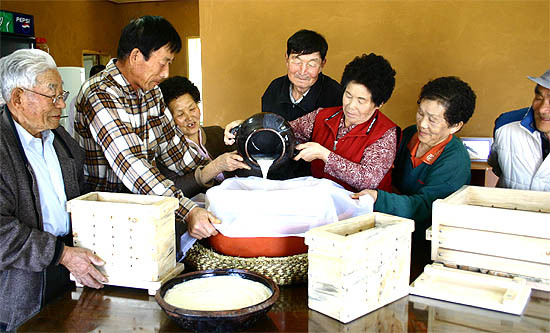 고창군 도산 아름마을 전통체험장에 웰빙식품 '두부가'를 창업한 10대 노인들이 두부를 만들고 있다. (desk@jjan.kr)