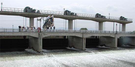 한국농촌공사 동진지사 백파통수식이 끝나자 수문을 통해 농업용수가 내려가고 있다. (desk@jjan.kr)