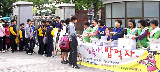 아침을 굶고 다니는 청소년들을 위해 전주 YWCA에서 ‘얘들아 밥먹자’ 캠페인을 벌였다. 9일 체육대회가 열리는 전주시 평화동 남중학교 앞에서는 YWCA 자원봉사자들이 등교하는 학생들을 대상으로 주먹밥을 나눠주며 청소년들의 먹거리 습관에 대한 설문조사를 실시했다.