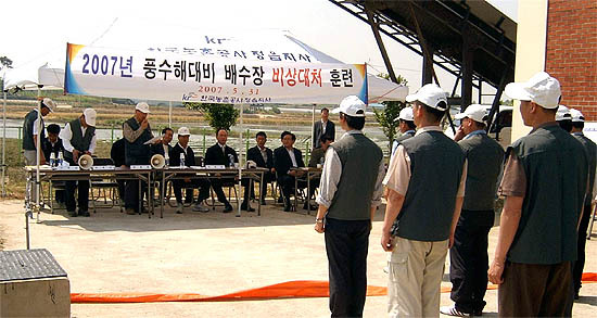지난달 31일 정읍시 이평면 오금리에 위치한 오금배수장에서 임석관인 농림부 김일환 서기관을 비롯 도청과 시청관계자, 한전, 긴급복구 동원업체, 소방서, 지역주민 등 150여명이 참석한 가운데 여름철 호우로 인한 침수방지 가상훈련을 실시한 것.