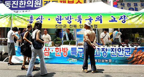 진안군은 지난 2일까지 3일간 서울약령시장에서 열린 ‘한의약문화축제‘에 송영선 진안군수를 비롯 이정열 정책기획단장, 마케팅지원팀, 전북인삼농협 관계자, 가막마을 장뇌삼 재배 농가 등 10여 명이 참여해 진안 홍삼 등 진안지역에서 생산되는 한약재의 우수성을 전국에 홍보했다.