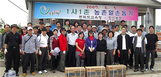 도교육청 직원 40여명이 5일 농촌사랑을 위해 자매결연을 맺은 김제시 용지면 장신리 장신농원마을을 찾아 일손돕기에 나섰다. 직원들은 이날 감자캐기와 포도 순지르기 등에 참여하며 구슬땀을 흘렸다.