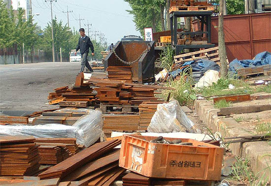 크고 작은 철판들이 여기저기 쌓여져 작업장을 방불케 했다. 도로와 인도를 점령한지 이미 오래인 듯하다. 지나는 이들이 발길을 가로막은 적치물에 불만을 토로한다.
