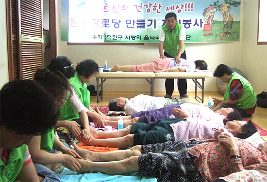 늘어나는 노령인구에 대한 복지서비스 확대 필요성에 따라 어르신들의 건강관리와 활기찬 노후생활을 지원하기 위해 수지침, 이미용, 발 클리닉, 이혈 등 전문자원봉사자들이 각 동별 경로당을 순회 방문하여 봉사활동을 펼치고 있는 것.