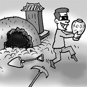 며칠전 전국을 돌며 도굴을 일삼아 온 일당 2명이 경찰에 붙잡혔다. 이들은 임실 운암과 익산 웅포, 경기도 여주, 경북 상주 등의 야산 묏자리에서 고려청자와 분청사기 등 고려와 조선시대 진품 도자기 10여 점을 도굴했다 경찰에 검거된 것이다. 20여 년전부터 배운 풍수지리를 활용해 명당이 있을 법한 곳을 찾아 쇠막대(탐침봉)로 1m-1m 30㎝ 가량 찔러 본후 주변을 파헤쳤다는 것이다. 요즘 도굴꾼들은 내시경 카메라까지 이용한다니 갈수록 수법이 정교해지는 모양이다. 이집트가 유명해진 것은 도굴 덕분이라는 말이 있긴 하나 도굴은 결국 범죄일 뿐이다.