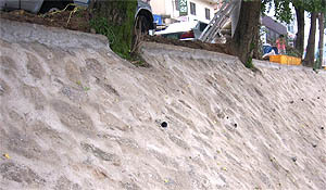 기존 석축을 모두 뜯어낸 자리에 새로이 사석을 쌓고, 벌어진 틈새는 콘크리트 메질로 채워넣는 찰쌓기 공법이 적용됐다.