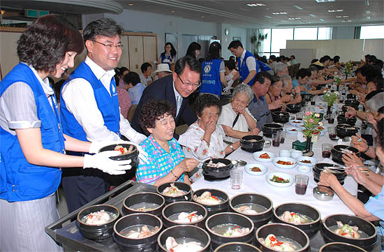 전북은행 지역사랑봉사단(단장 이강본)은 25일 중복을 맞아 본점 21층에서 무의탁 독거노인 100여명을 초청해 삼계탕을 대접하고 선풍기를 드리는 ‘독거노인 초청 외식나들이’ 행사를 실시했다.