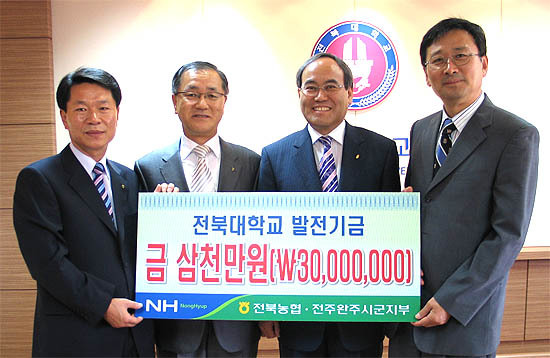 농협전주완주시군지부(지부장 김종엽)는 개교 60주년을 맞은 전북대에 발전기금으로 3000만원을 5일 전북대 총장실에서 서거석 총장· 황의영 전북농협 본부장 및 관계자들이 참석한 가운데 전달했다.