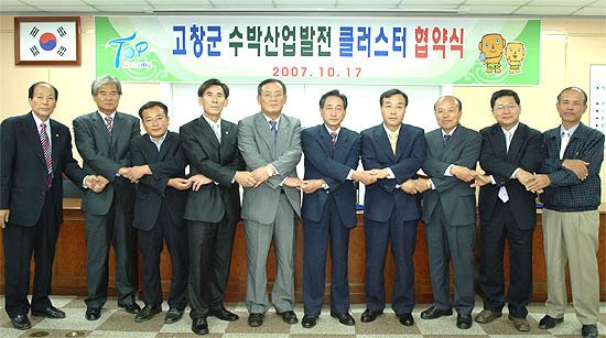 이강수 군수는 이날 "고창수박은 공동브랜드인 '황토배기G' 가 소비자가 뽑은 전국최고의 수박으로 2007년 대한민국 대표브랜드 대상에 선정된 바 있다" 면서 "제2의 전성기를 맞고 있는 고창수박산업은 산학관연 클러스터 협약체결을 계기로 더욱 발전할 것"이라고 밝혔다.