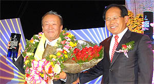 탤런트 임현식씨(왼쪽)가 지난 1일 강인형 군수로부터 순창군 홍보대사 위촉패를 받고 포즈를 취했다. (desk@jjan.kr)