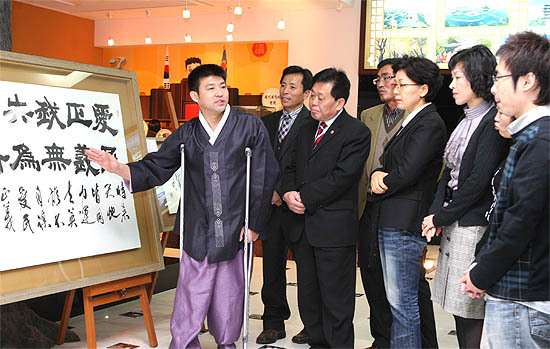 백담(百潭) 백종희선생 문하생 모임인 담묵회(회장 권창환 도의원) 회원들이 도의회 청사 1층 로비에서 서예작품전을 개최해 눈길을 끌고 있다.