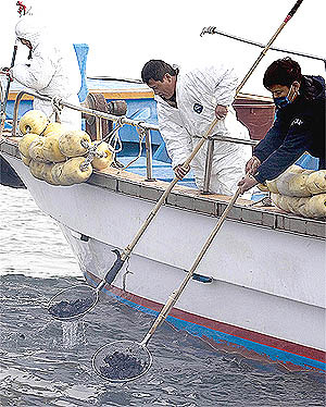 군산지역 앞바다에서 타르 덩어리가 눈에 띄자 군산시와 군산해경 관계자, 어민 등 50여명은 미리 준비한 뜰채와 갈고리, 방제복, 수거통 등을 갖춘 뒤 해경선과 어선 10여척을 이용해 이날 오전 10시께 현장으로 향했다. 출발지인 비응항에서 개야도 및 연도까지는 어선으로 30분 거리(30∼40㎞). 원유유출 해역으로부터 120㎞ 거리인 군산 앞바다까지 사고발생 10일만에 타르 덩어리들이 흘러 들어온 셈이다.