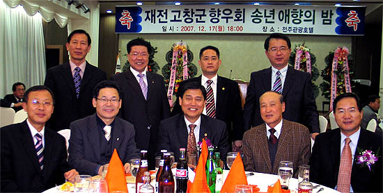 재전고창향우회(회장 정동렬) ‘2007년 송년 행사’가 17일 저녁 전주관광호텔에서 성황리에 열렸다. 이날 행사에는 이강수 고창군수, 장세영 고창군의회 의장, 조병채 고창애향운동본부장, 신국중 전북도 교육위의장, 김봉직 고문, 정균환 대통합신당 최고위원, 김재금 우석대 사무처장, 조창환 고창신문사장 등 200명의 회원들이 참석했다.