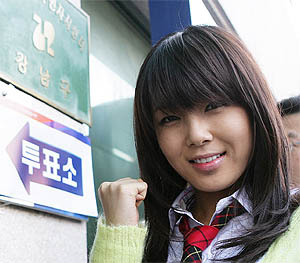 인기그룹 원더걸스의 멤버 유빈(김유빈)이 제 17대 대통령 선거 투표를 위해 19일 오후 청담1동사무소에 마련된 투표소를 찾아 투표하기에 앞서 차례를 기다리고 있다.