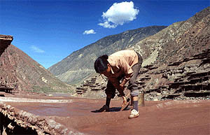 붉은 소금이 나오는 곳은 난창강(메콩강의 상류)변 옌징(티벳어 차카롱). 강기슭의 자다촌에는 수십 개의 소금우물이 있다. 이 우물에서 나오는 소금물로 붉은 소금이 생산된다.어떻게 바다가 아닌 내륙 깊숙한 곳에서 소금이 만들어질까? 지각 대변동으로 과거의 바다가 융기하여 이곳의 우물에서 바닷물이 샘솟는 것이다.