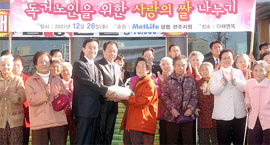 메트라이프 생명 전주지점(지점장 김승곤)은 26일 연말을 맞아 독거노인에게 사랑의 쌀(10kg 120부대)을 전달하고 점심식사를 제공했다. 우리노인 복지센터를 통해 전달된 이번 행사는 메트라이프 생명 전주지점 직원들이 매월 모금한 성금으로 나눔행사와 봉사활동등을 벌였다.