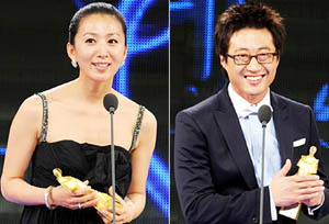 31일 저녁 SBS 등촌동 공개홀에서 '2007 SBS 연기대상'이 생방송으로 열린 가운데 김희애(왼쪽)와 박신양이 대상을 받고 소감을 말하고 있다.../연합뉴스 (desk@jjan.kr)