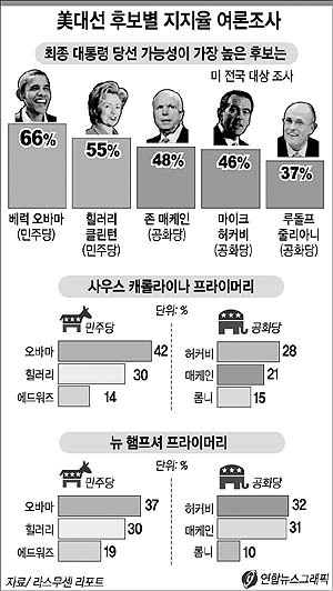 2008년 미국 대선 초반 후보경선에서 돌풍을 일으키고 있는 버락 오바마 민주당 상원의원이 최종 대통령 당선 가능성이 가장 높은 것으로 여론조사 결과 나타났다고 라스무센 리포트가 8일 밝혔다.