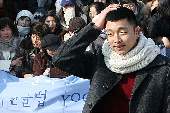 지난해 인기몰이를 한 드라마 '커피프린스 1호점'의 탤런트 공유가 14일 충남 논산 육군훈련소 정문 앞에서 입소 전 취재진과 인터뷰를 하며 어색한 듯 머리를 만지고 있다.