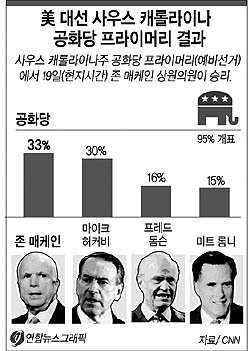 11.4 미국 대통령 선거' 남부지역 표심의 첫 가늠자인 사우스 캐롤라이나주 공화당 프라이머리(예비선거)에서 19일 존 매케인 상원의원이 승리, 선두 부상의 발판을 마련했다.