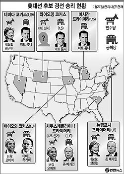 최초의 흑인 미국 대통령을 꿈꾸는 버락 오바마상원의원이 26일(현지시간) 미 대선 사우스 캐롤라이나주 민주당 경선에서 힐러리 클린턴 상원의원을 압도적 표차로 누르고 승리했다. 美대선 후보 경선 승리 현황.