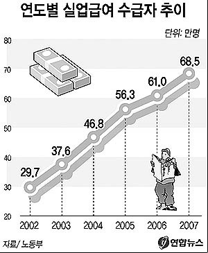 이는 고용보험 적용 대상 확대 등으로 사회안전망인 실업급여제 이용자가 늘어난데다 일자리 창출이 부진한데 따른 것으로 분석된다. 실업급여 수급자는 2002년 29만7천명을 기록한 뒤 2003년 37만6천명, 2004년 46만8천명, 2005년 56만3천명 등으로 지속적으로 증가하고 있다.
