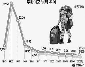 3만7천500여명이던 주한미군은 2004년 5천명, 2005년 3천명, 2006년 1천명이 각각 줄어 현재 2만8천500명이며 최종 2만5천여명 수준으로 유지한다는 한.미간 합의에 따라 올해 말까지 3천500명이 더 감축될 예정이다.