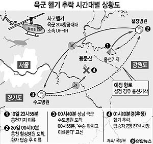 육군에 따르면 사고 헬기는 19일 저녁 강원도 홍천 국군철정병원에서 경기도 성남 국군수도병원으로 뇌출혈을 일으킨 육군 모 군단 소속 윤모 상병을 긴급 수송한 뒤 20일 새벽 0시55분께 수도병원을 출발, 복귀하던 중 오전 1시40분께 레이더에서 사라지면서 교신이 끊겼다.