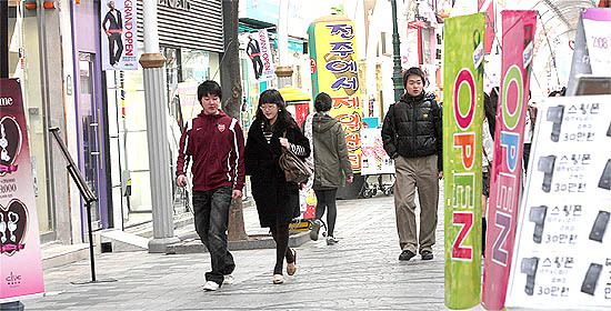 20일 전주시내 걷고싶은 거리. 주변의 일부 업소들은 경쟁적으로 판촉을 위한 음악 등을 외부 스피커를 통해 내보고 있었고, 각종 광고전단·시설물·입간판 등이 인도를 점령하고 있었다.