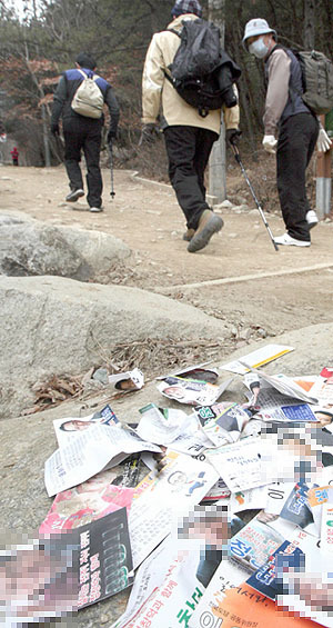 [현장속으로]주말 등산로서 예비후보 관계자들 무분별 배포