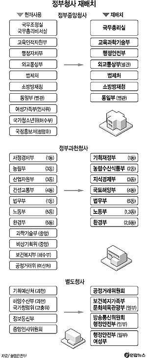 행정안전부는 2일 "정부 조직개편에 따른 후속조치로 정부청사별 재배치 계획을 확정했다"면서 "개편 조직의 화합적 융합을 위해 통합부처는 동일 건물내에 우선 배치한다는 기본원칙하에 사회부처는 중앙청사와 그 주변으로, 경제부처는 과천청사와 그 주변으로 각각 배치했다"고 설명했다.