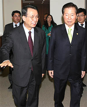 한승수 국무총리가 11일 오후 서울 동교동 김대중 도서관으로 김대중 전 대통령을 예방한뒤 함께 걸어 나오고 있다.