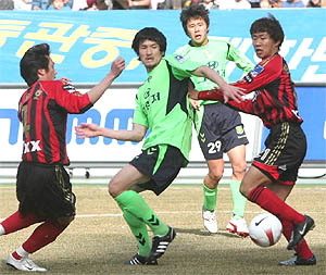 K-리그에 복귀한 조재진선수가 FC 서울 수비수 2명에게 밀착 수비를 당하고 있다. (desk@jjan.kr)