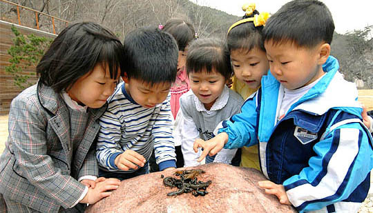 25일 순창 강천산에 생태체험학습을 위해 나온 아이들이 개구리를 보며 즐거워하고 있다. (desk@jjan.kr)