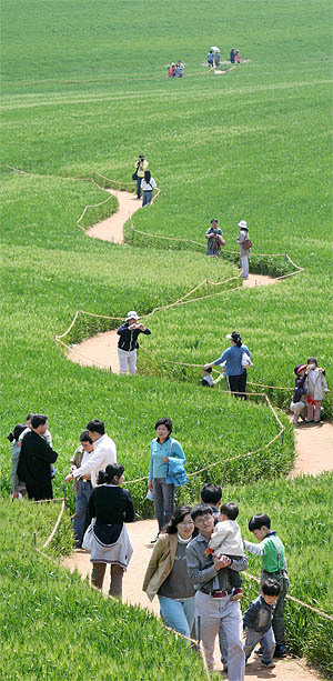고창 청보리밭축제가 오는 12일부터 한달간 공음면 학원농장 일대 100만㎡의 청보리밭에서 펼쳐진다. 다섯번째를 맞는 이 축제는 농업을 '먹는 것'에서 '보고 즐기는 것'으로 바꾸는 경관농업의 전형을 제시, 올해 농림수산식품부로부터 전국 최우수 농촌축제로 선정됐다.