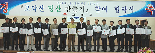 김제시는 10일 시청 상황실에서 이건식 시장을 비롯 안기순 시의회 의장, 이승길 김제경찰서장, 목우촌 관계자, 관내 기관 및 사회단체장 등 17개 기관·단체 관계자가 참석한 가운데 모악산 명산 만들기 참여 협약을 체결하고, 모악산 명산 만들기에 앞장서기로 다짐했다.