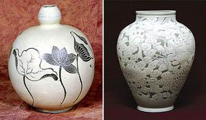 이번에 전시된 작품은 전통을 바탕으로 하고 있지만, 현대적인 디자인으로 포인트를 준 분청 28점. 분청의 대표적인 상감기법(그린 무늬 부분을 긁어낸 뒤 백토, 자토 등을 넣고 유약을 발라 구워내는 방법)을 이용했다.