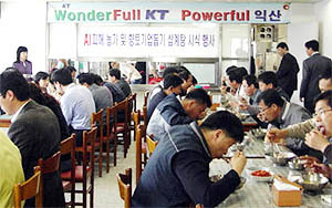 KT익산지사(지사장 정일천)는 15일 'AI피해 농가 돕기 위한 삼계탕 시식'행사를 마련하고, 구내식당에서 지사 직원들에게 점심으로 삼계탕을 제공했다.